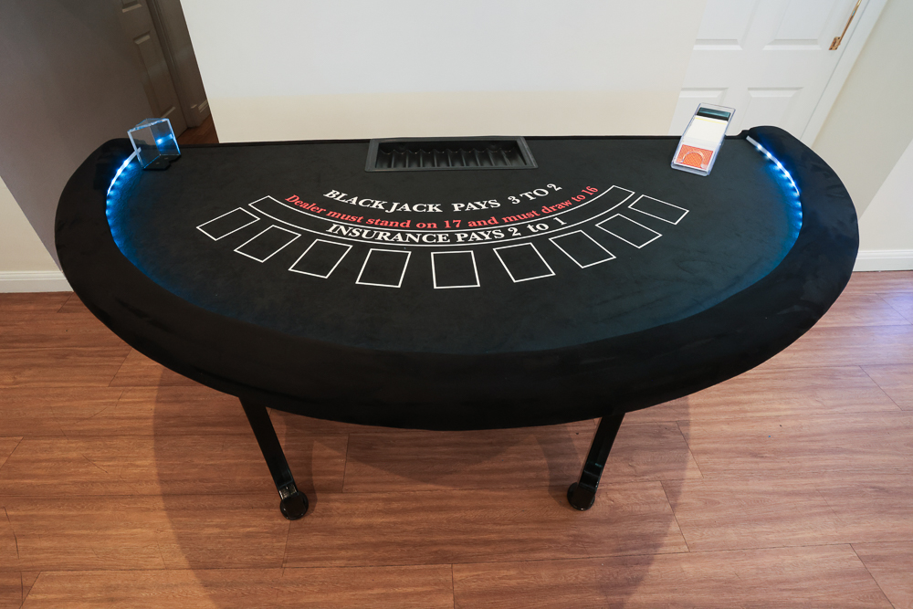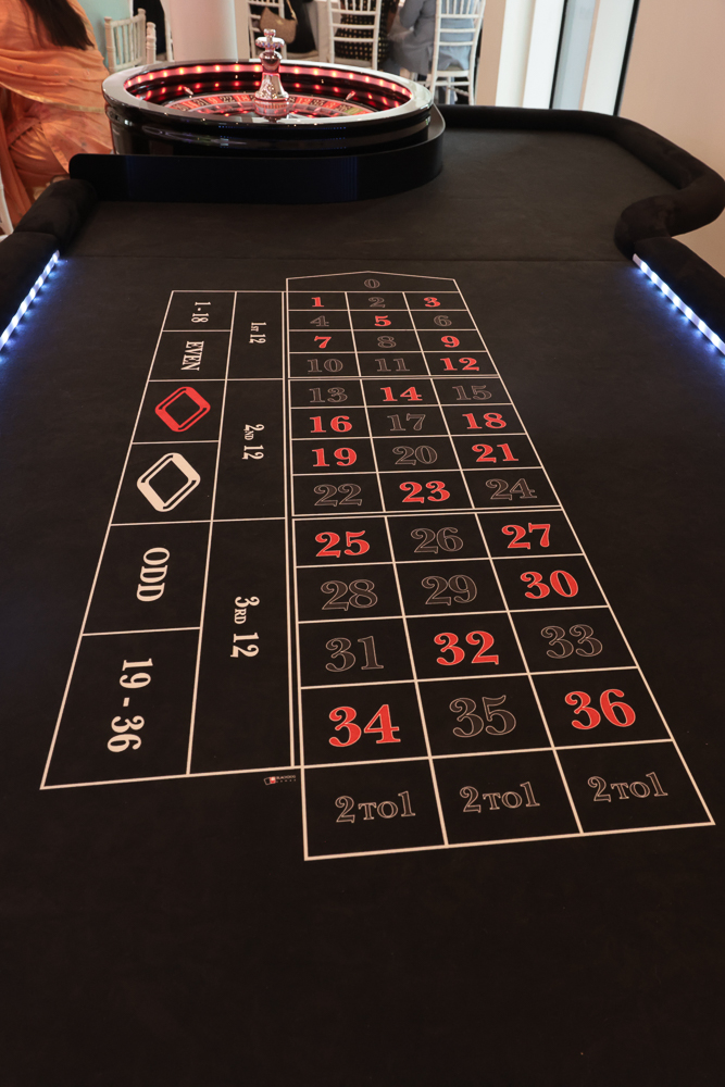 The roulette table features a premium, high-polish black gloss roulette wheel with an LED inlay. This adds a dramatic, contemporary flair to the traditional game, perfectly suited for modern venues and upscale events. The LED inlay adds a subtle but impactful glow, especially effective in dimly lit rooms or evening functions, ensuring the roulette wheel becomes a true showstopper.